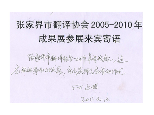 2010年12月8日—2011年2月20日市翻译协会在岳阳地区,长沙市、张家界市区举办了2005-2010年翻译成果巡回展活动,图为来宾寄语