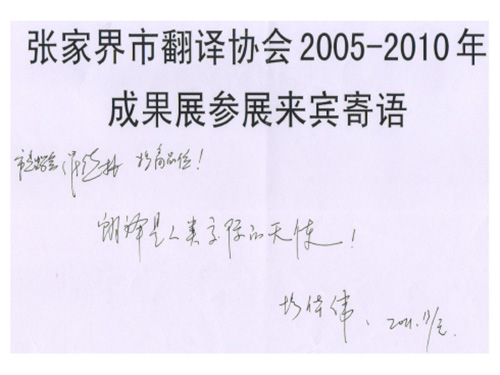 2010年12月8日—2011年2月20日市翻译协会在岳阳地区,长沙市、张家界市区举办了2005-2010年翻译成果巡回展活动,图为来宾寄语3