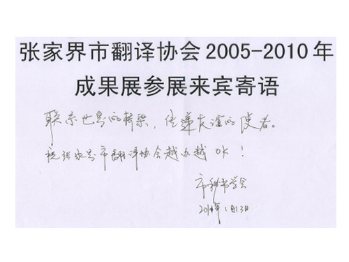 2010年12月8日—2011年2月20日市翻译协会在岳阳地区,长沙市、张家界市区举办了2005-2010年翻译成果巡回展活动,图为来宾寄语7