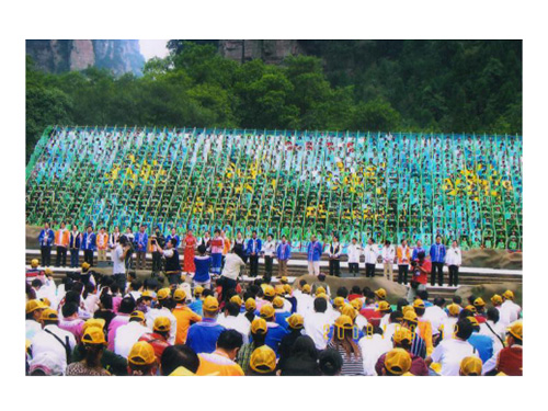 图为2008年3月21日,2008中国湖南张家界国际森林保护节暨张家界国家森林公园建园25周年庆典,在张家界国家森林公园老磨湾广场进行。市翻译工作者积极参加开幕式现场翻译工作