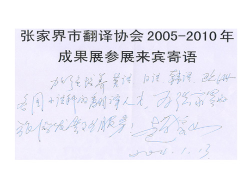 2010年12月8日—2011年2月20日市翻译协会在岳阳地区,长沙市、张家界市区举办了2005-2010年翻译成果巡回展活动,图为来宾寄语1